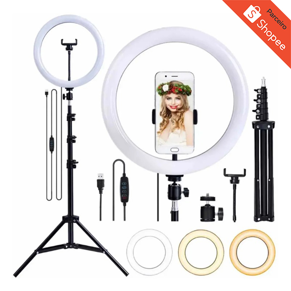 Ring light para gravações e selfies. Suas fotos e vídeos com qualidade profissional! A Ring light 26CM / 10 polegadas polegadas possuí controle integrado ao próprio cabo USB que regula os tons de cores da luz (são 3 tons. amarelo, branco frio e branco com amarelo).