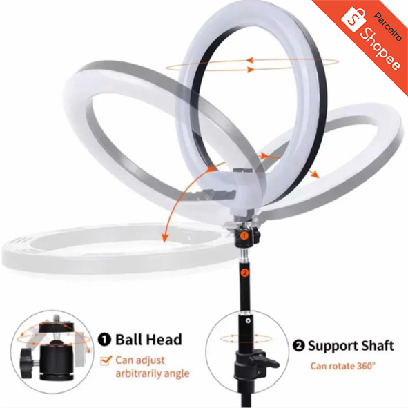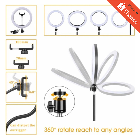 A Ring light possuí uma haste flexível (suporte de celular) ao meio do LED para prender o celular, proporcionando conforto para bater suas fotos e vídeo tanto verticalmente, horizontalmente, pra cima ou para baixo, por ser flexível você pode deixar na posição desejada! Além de um excelente Ring Light você também vai ter um tripé Profissional com altura máxima de 2,10m e minima de 65 cm *ATENÇÃO*