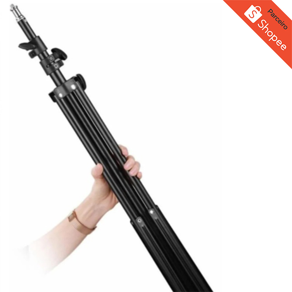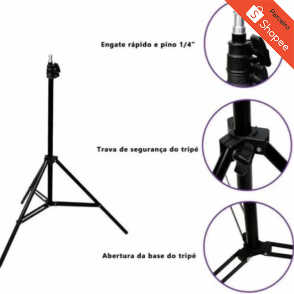 – Tripé com altura máxima de 2,10m e mínima de 65 cm
